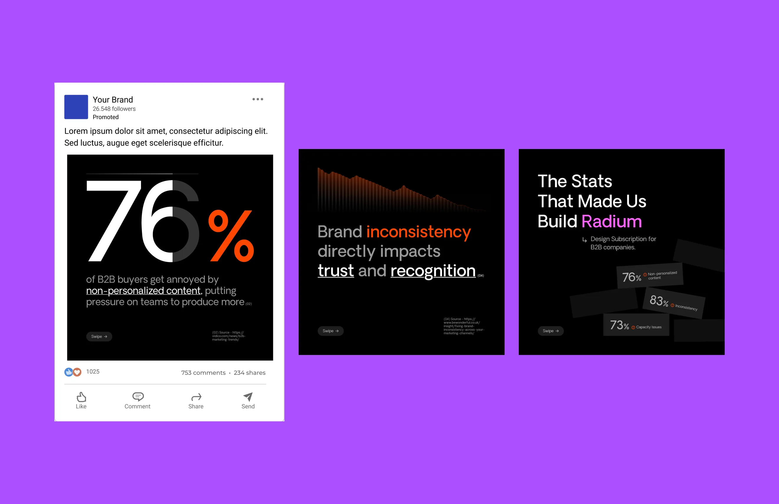 Our identity centers on “kaleidoscopic pixels”, the fundamental building blocks of digital design. Using a clean sans-serif typeface, the identity balances B2B professionalism with transformative impact. This visual system positions Radium as an architect of visual experiences, turning creative challenges into impactful, scalable collaterals that fuels long-term brand growth.