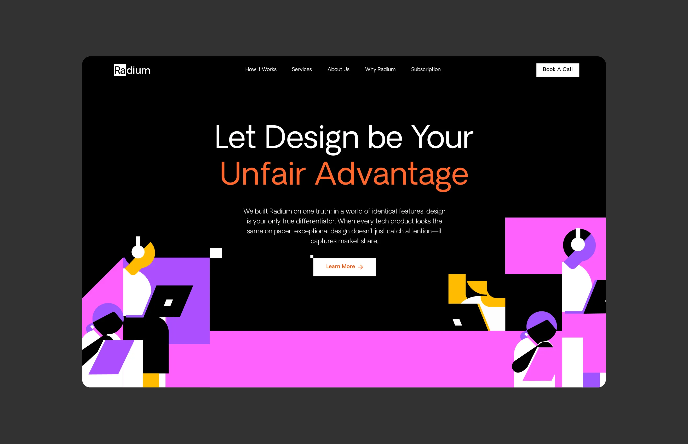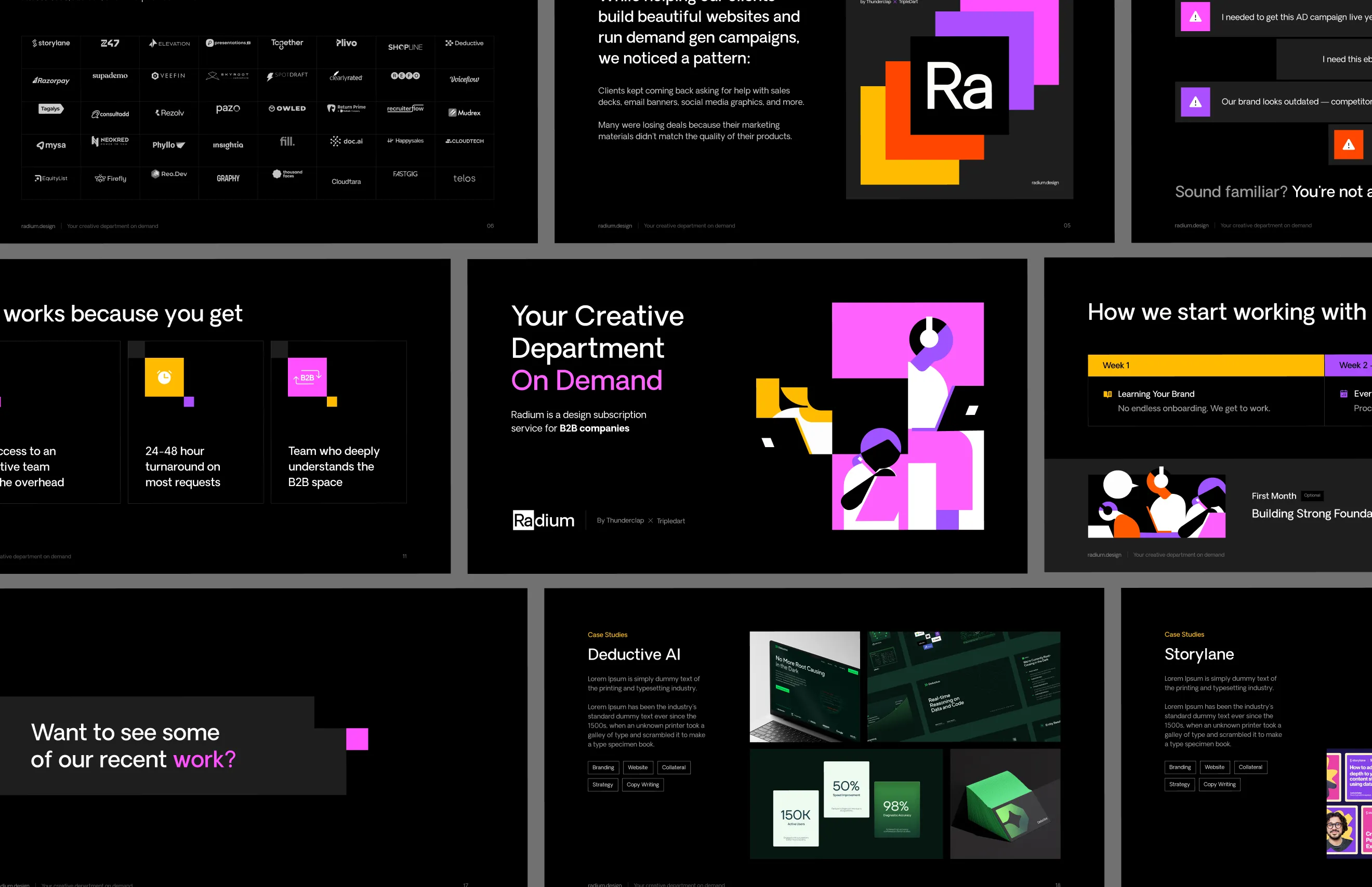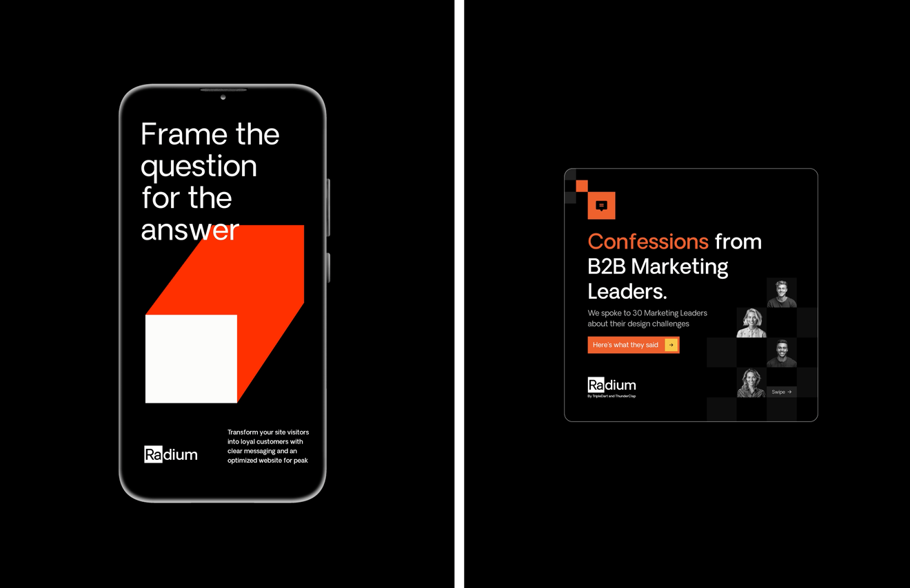 Radium is a specialized B2B creative-on-demand agency and sister to Thunderclap. Operating on a retainership model, we provide SaaS founders and marketing managers with a dedicated team for their digital design needs. The challenge was to cue radium as a B2B "caregiver" partner, that strikes balance between creative energy with grounded intent that delivers results.