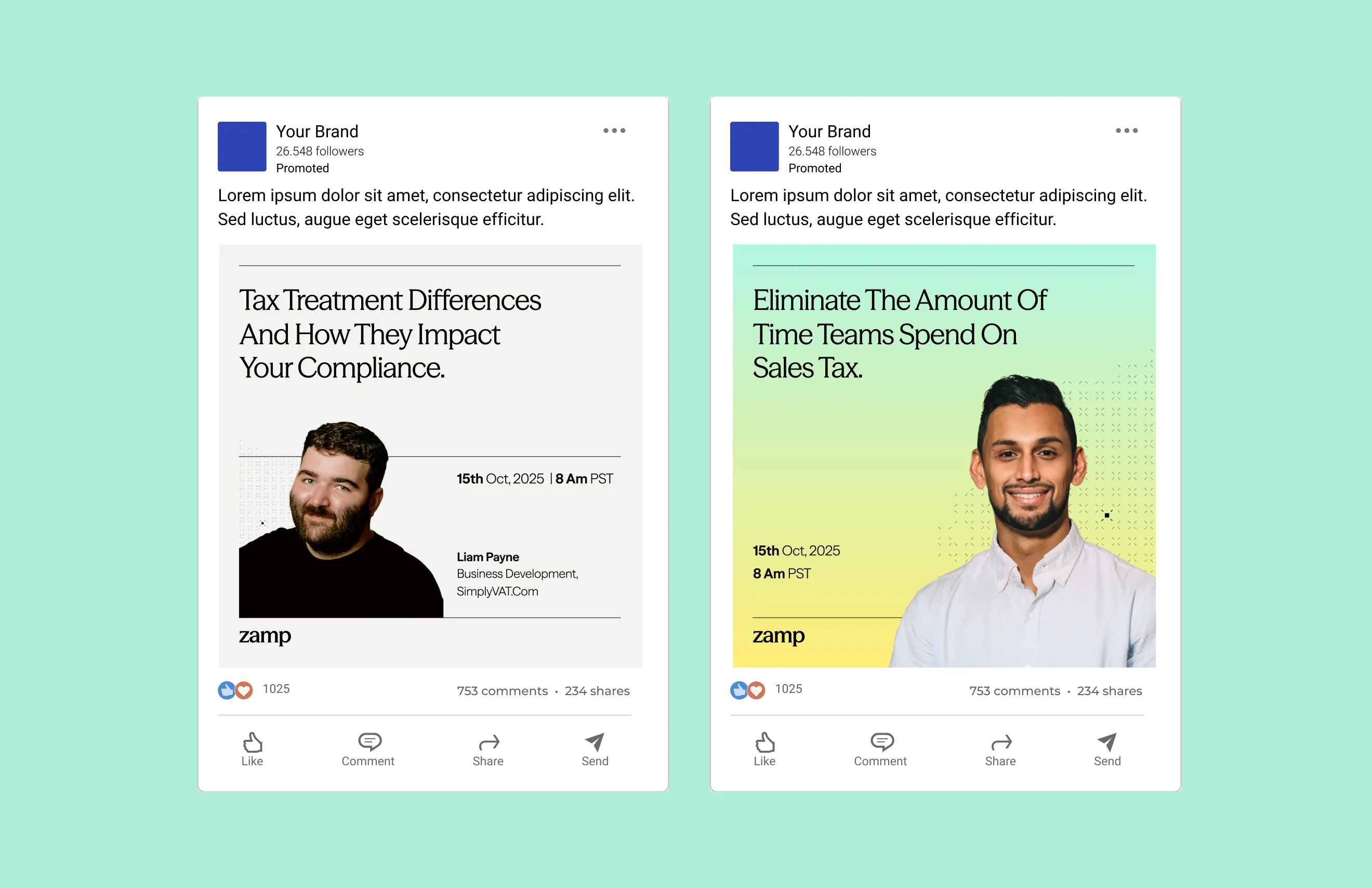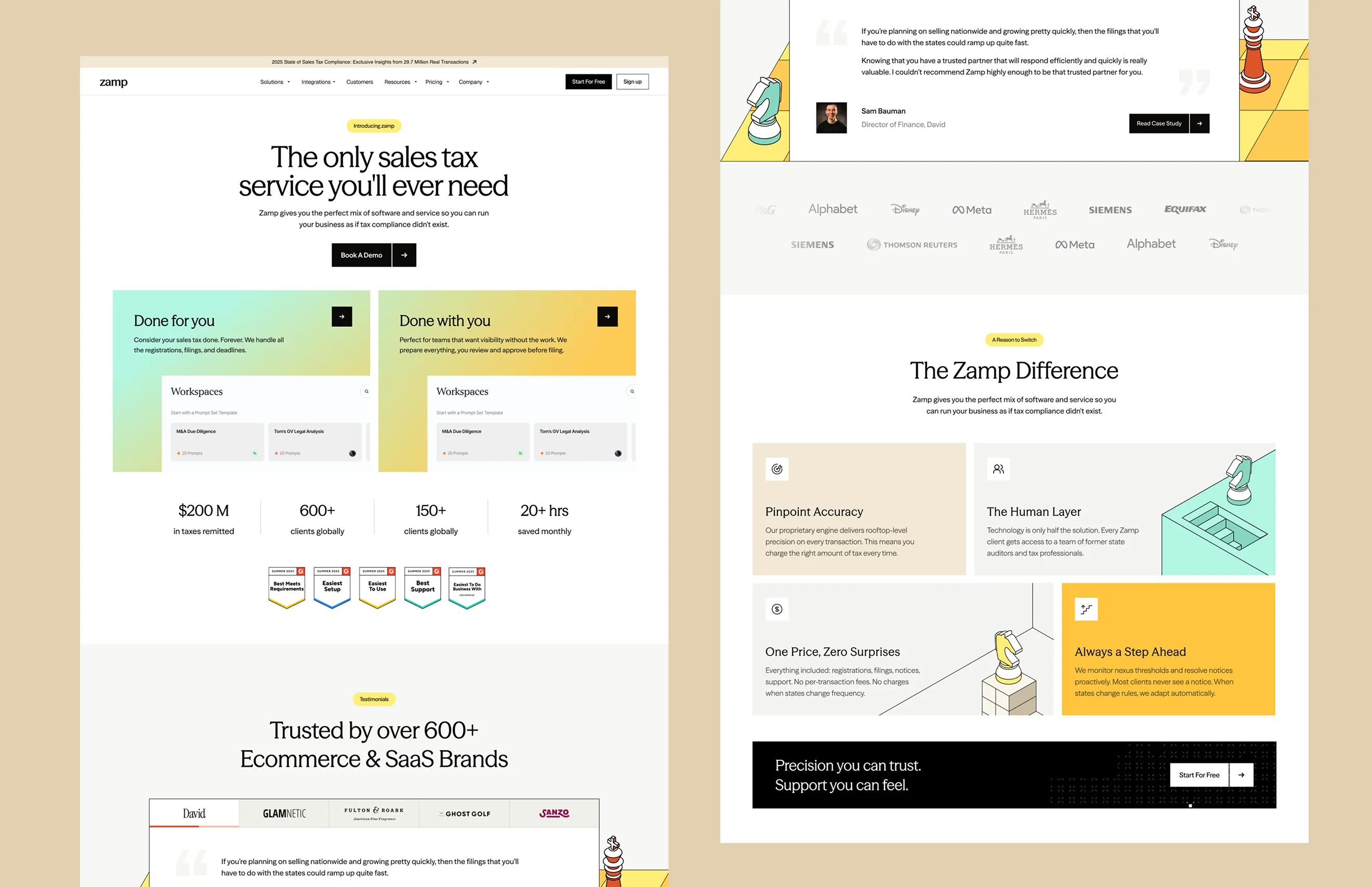 Zamp simplifies complex sales tax compliance for growing eCommerce and SaaS businesses. Combining a rooftop-accurate engine with veteran auditor expertise, Zamp provides a fully managed solution including 99.9% reliable filings and white-glove onboarding. The goal was to position Zamp as a knowledgeable, pragmatic, and approachable sales tax partner.